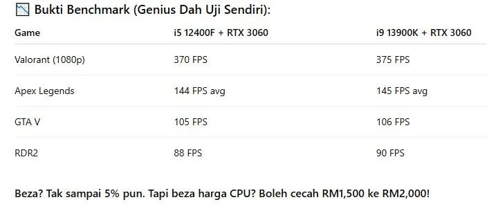 Tak salah beli mahal kalau betul-betul guna. Tapi kalau sekadar nak main game biasa atas monitor 1080p 60Hz, CPU gila power tu cuma buat satu benda je: